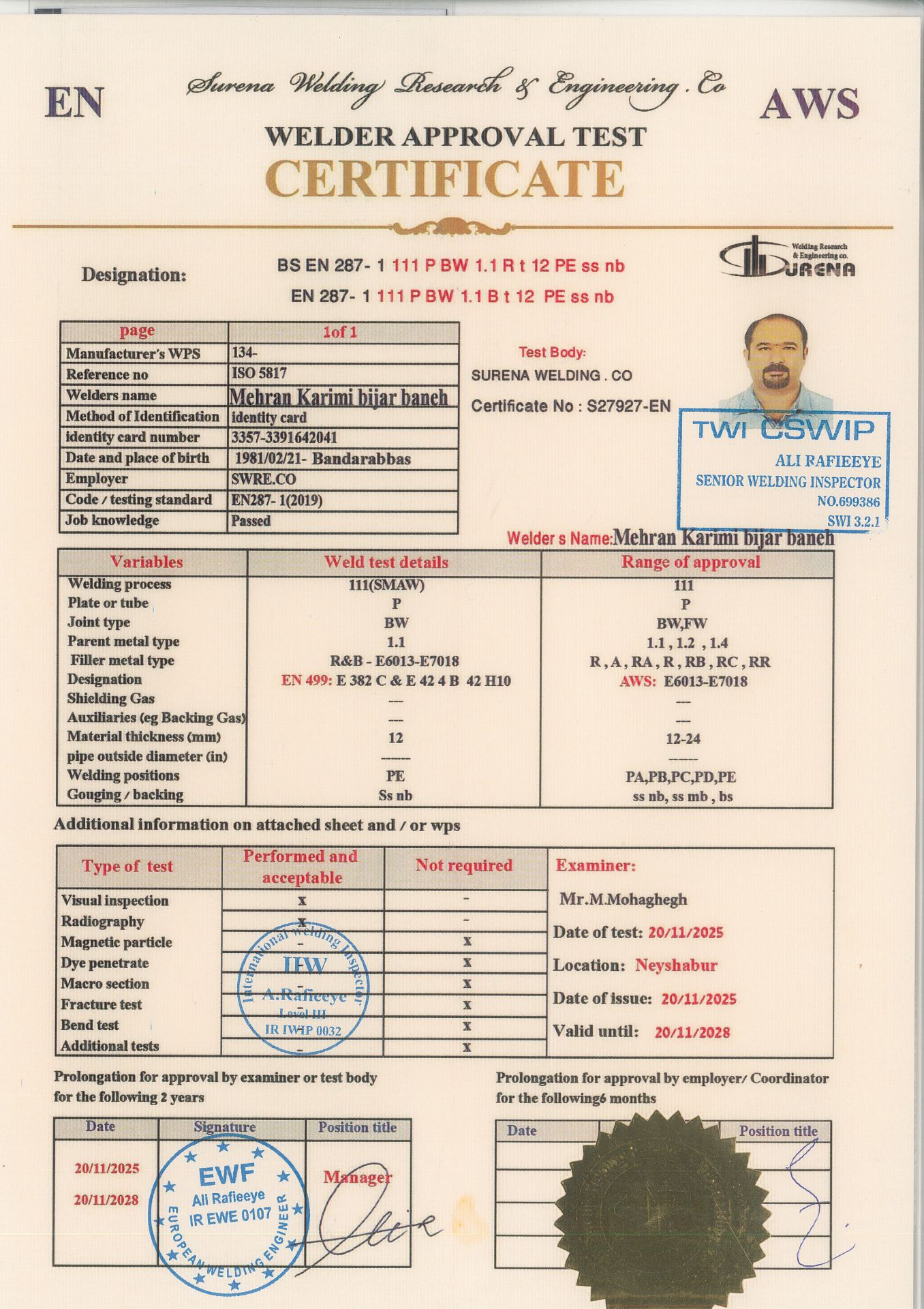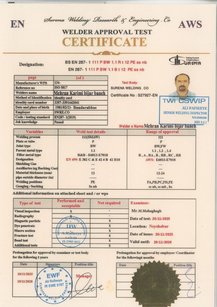 I worked in the production and assembly of gearboxes at Niroo Mohareke Industrial Company. From 2005 to 2025, I served as Maintenance Supervisor in the production hall, responsible for repair and troubleshooting activities, including mechanical and electrical repairs, industrial welding, and precision setup and adjustment of sanding, polishing, nano-wax, and automated packaging systems.